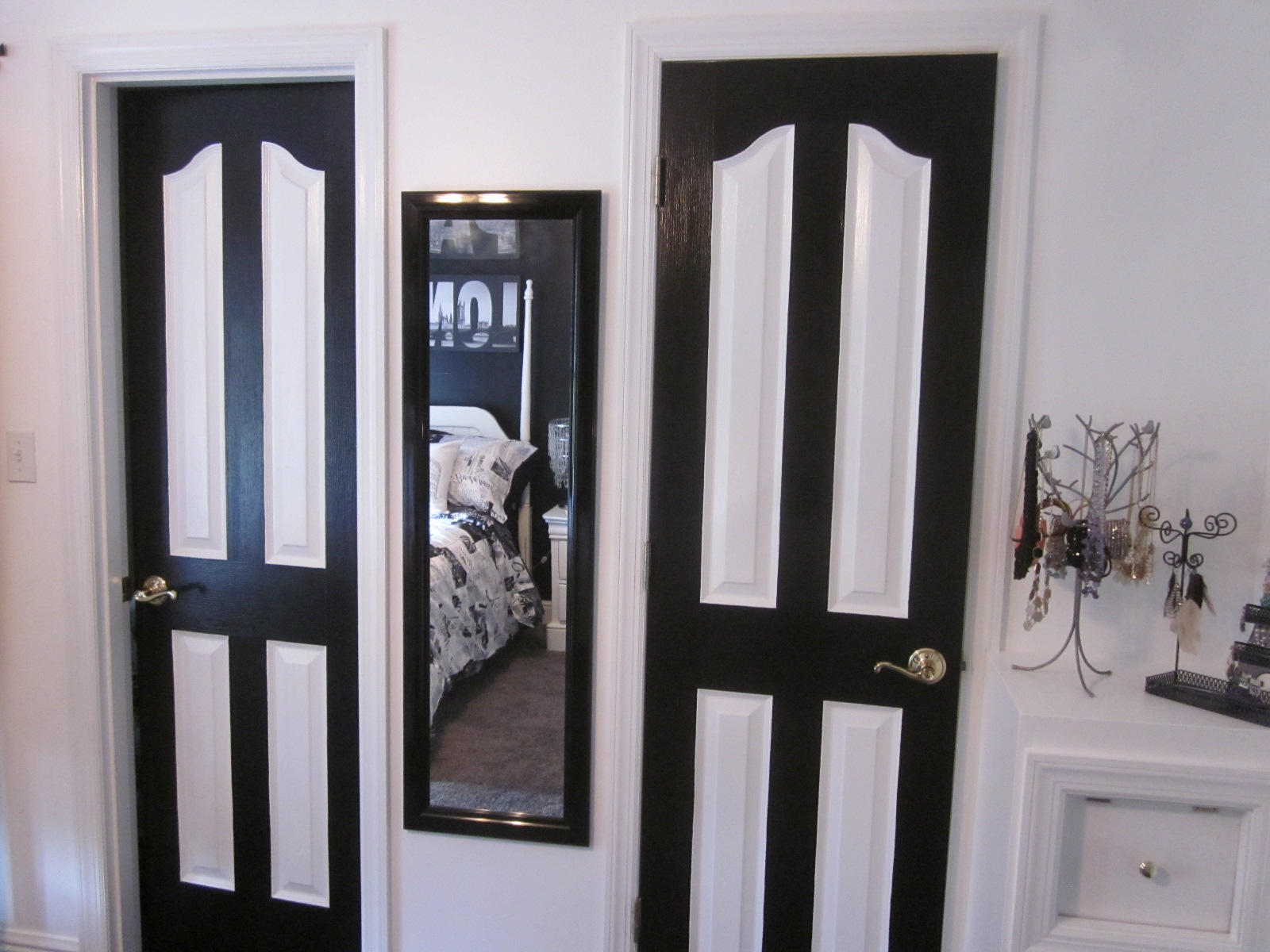 Our suggestion for the doors was to do the raised edges leaving the panel interior sections white. With the addition of a black framed mirror in between, it turned out great! Enjoy!