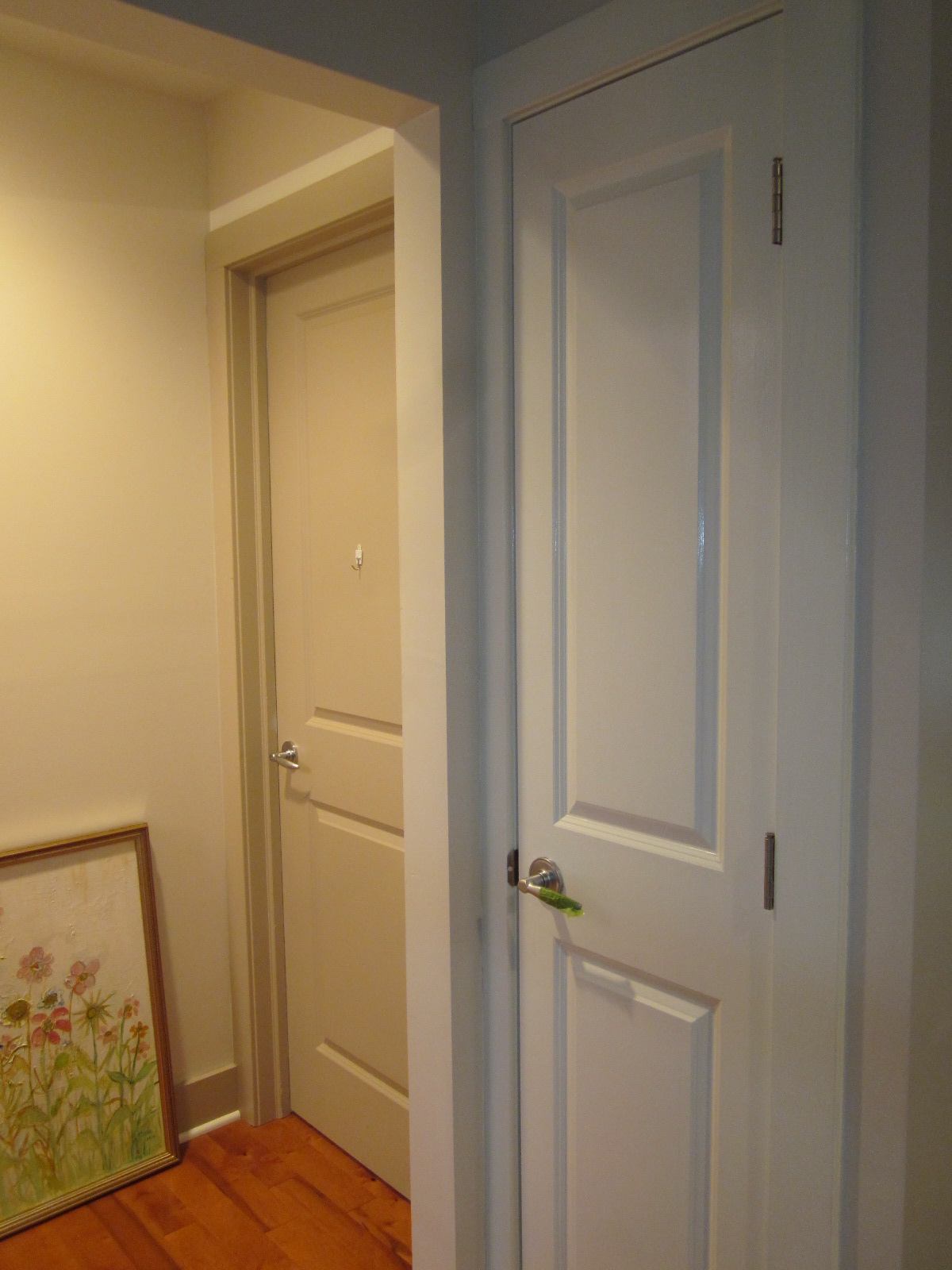 Here at the other end there are actually 2 more bedroom doors, the thin closet door, and associated trim. The closet door is painted and you can see the original color on the far bedroom door. Everything has been painted with two coats of Dover White High Gloss paint from Sherwin Williams. Enjoy!