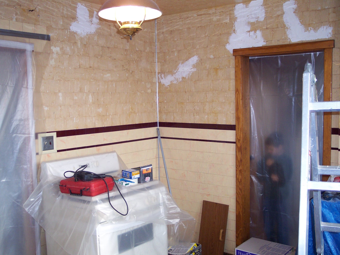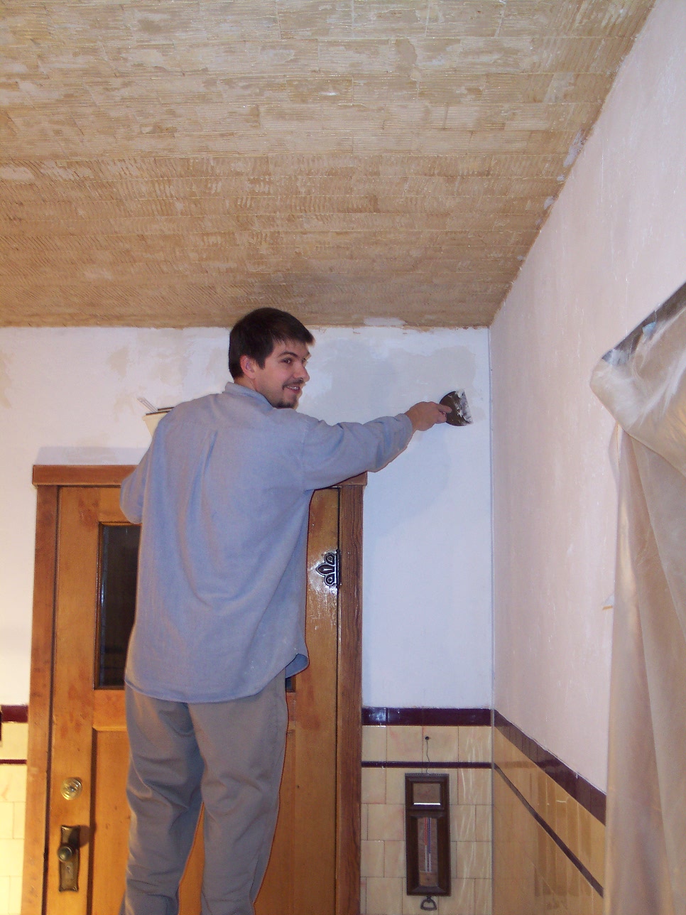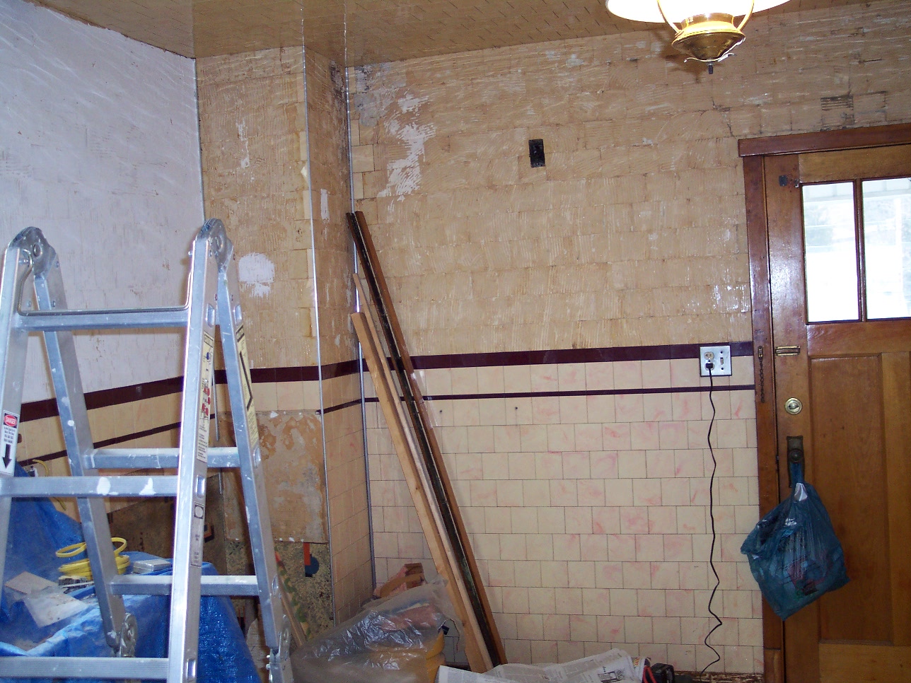 We decided on a "Mediterranean" style finish on the walls. This will help cover the unevenness and add a nice touch to an old house. We only removed down to the accent tile line with our plans in mind.
