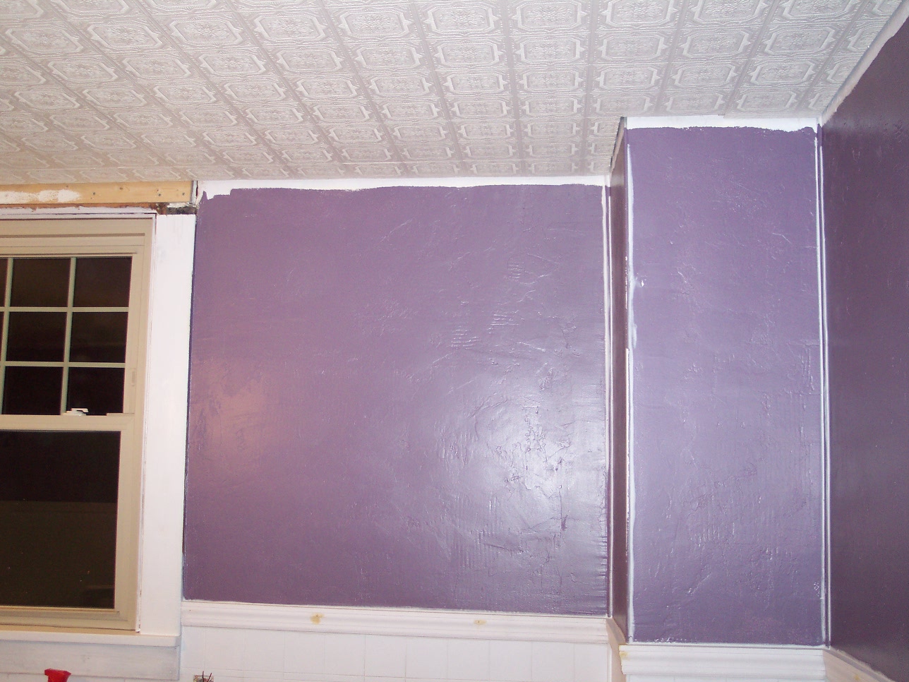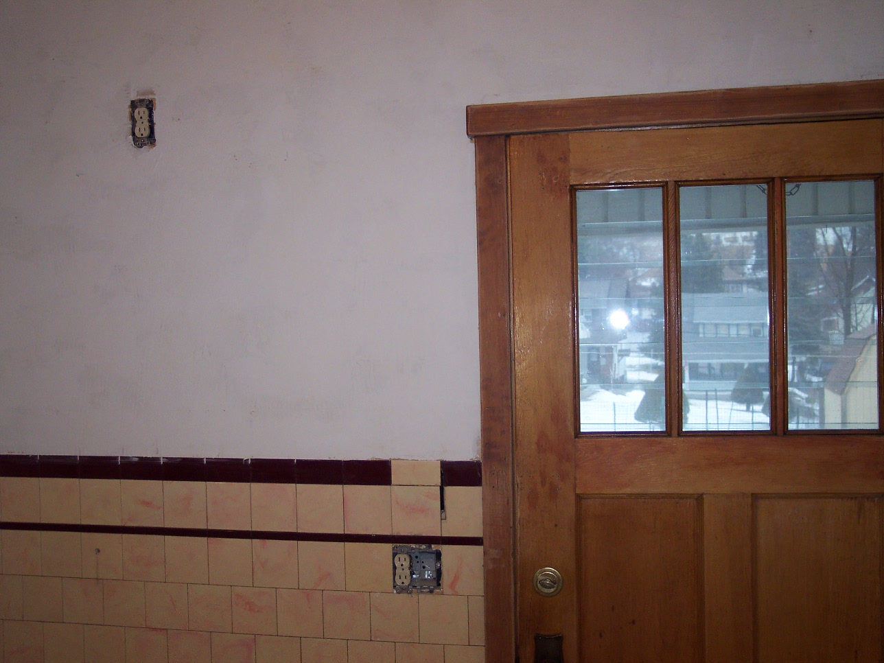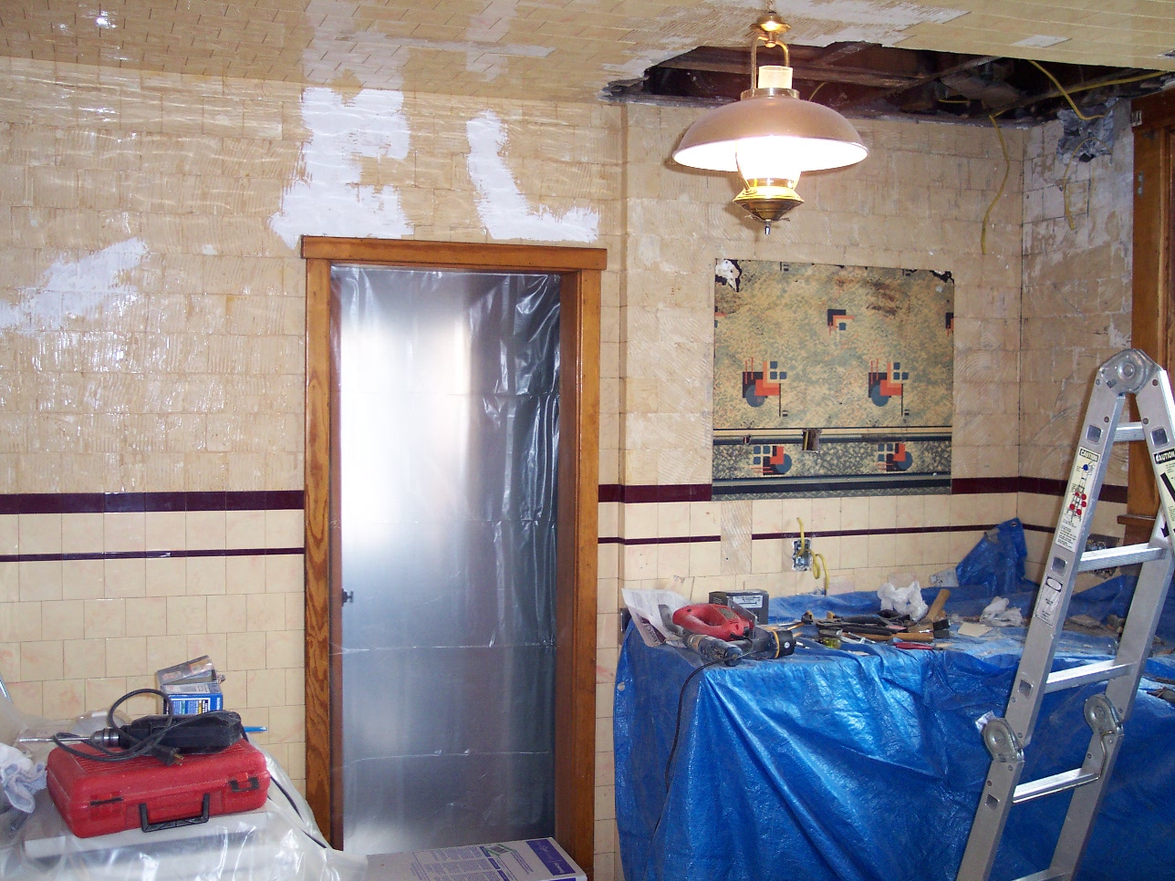 We decided on a "Mediterranean" style finish on the walls. This will help cover the unevenness and add a nice touch to an old house. We only removed down to the accent tile line with our plans in mind.