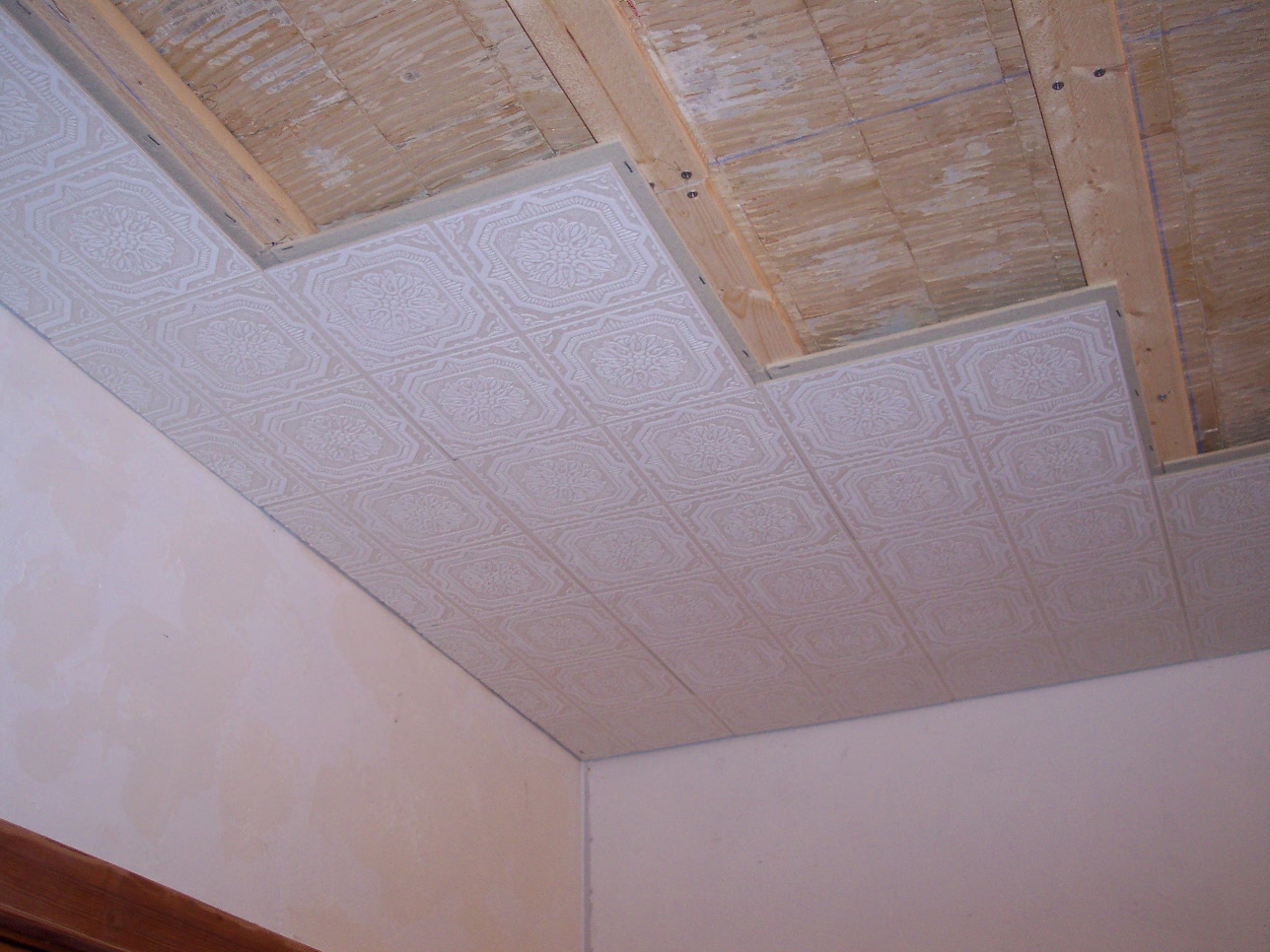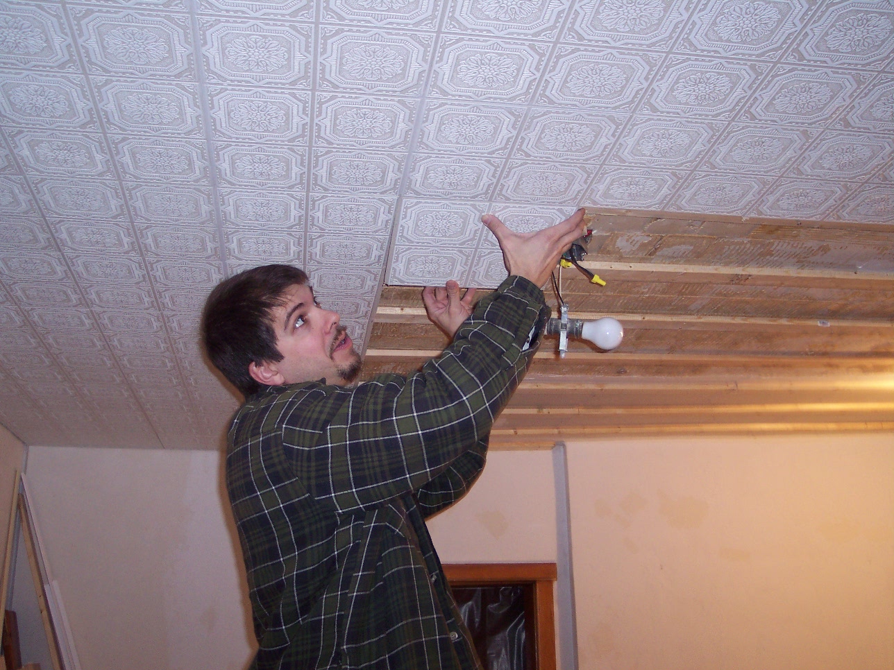 Next came the furring strips on the ceiling. It takes time to get it all level but the finished product is worth the extra time. We spaced the strips at 12" intervals for placing our ceiling tiles. The Armstrong ceiling tiles are tongue and groove for easy installation. They are also partially constructed of recycled materials. Measure your room and adjust the size of your first row so you don't have a full panel on one side of the room and just a sliver on the other. We wound up cutting off approximately 3" so the sides would be even. Here you can see them going into place. They are easy to trim, so holes for light fixtures are no problem.