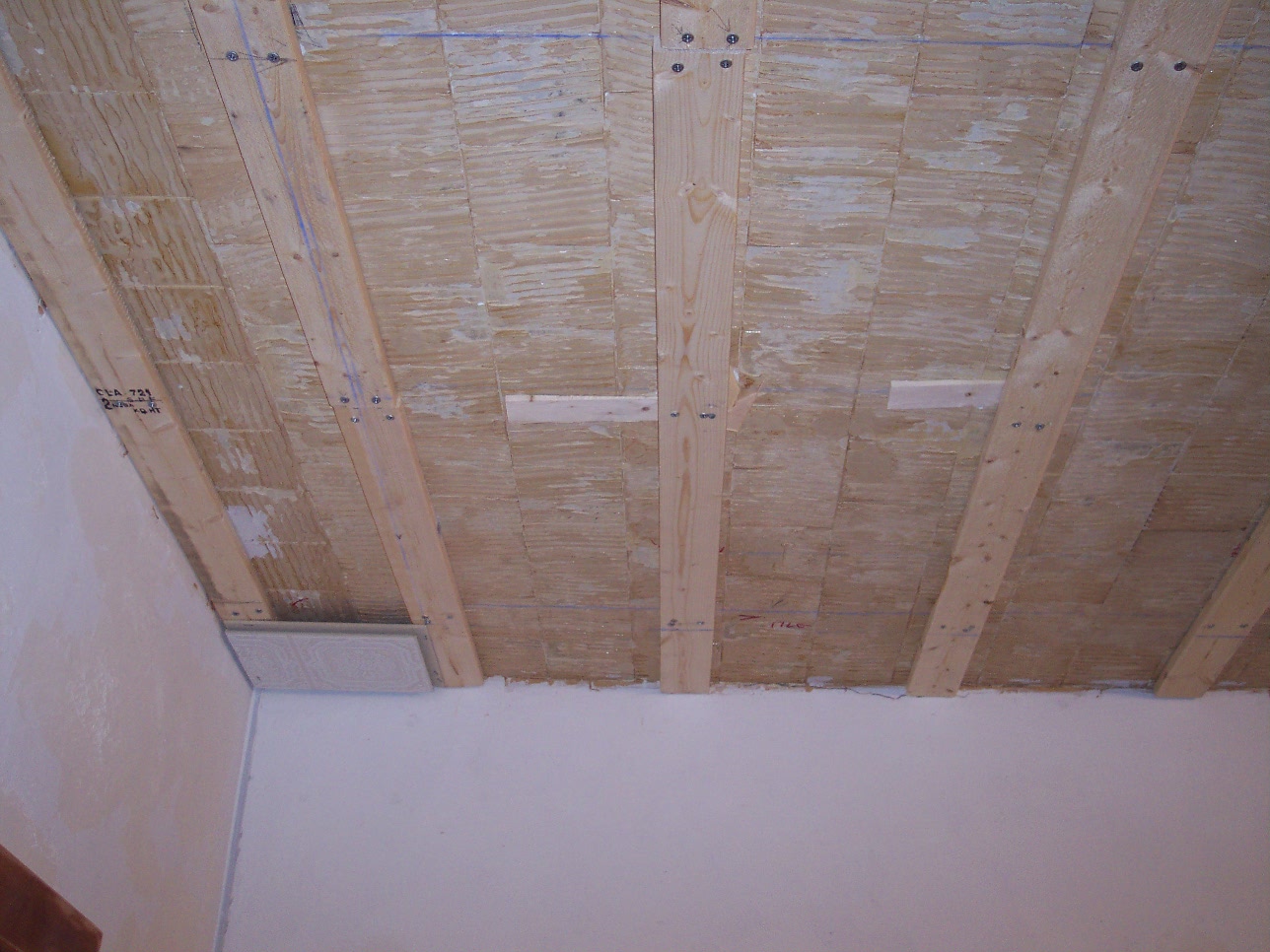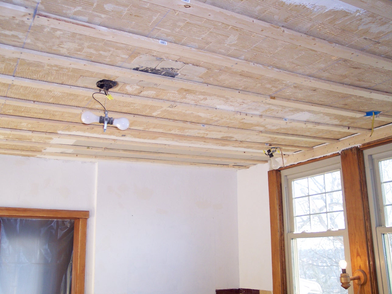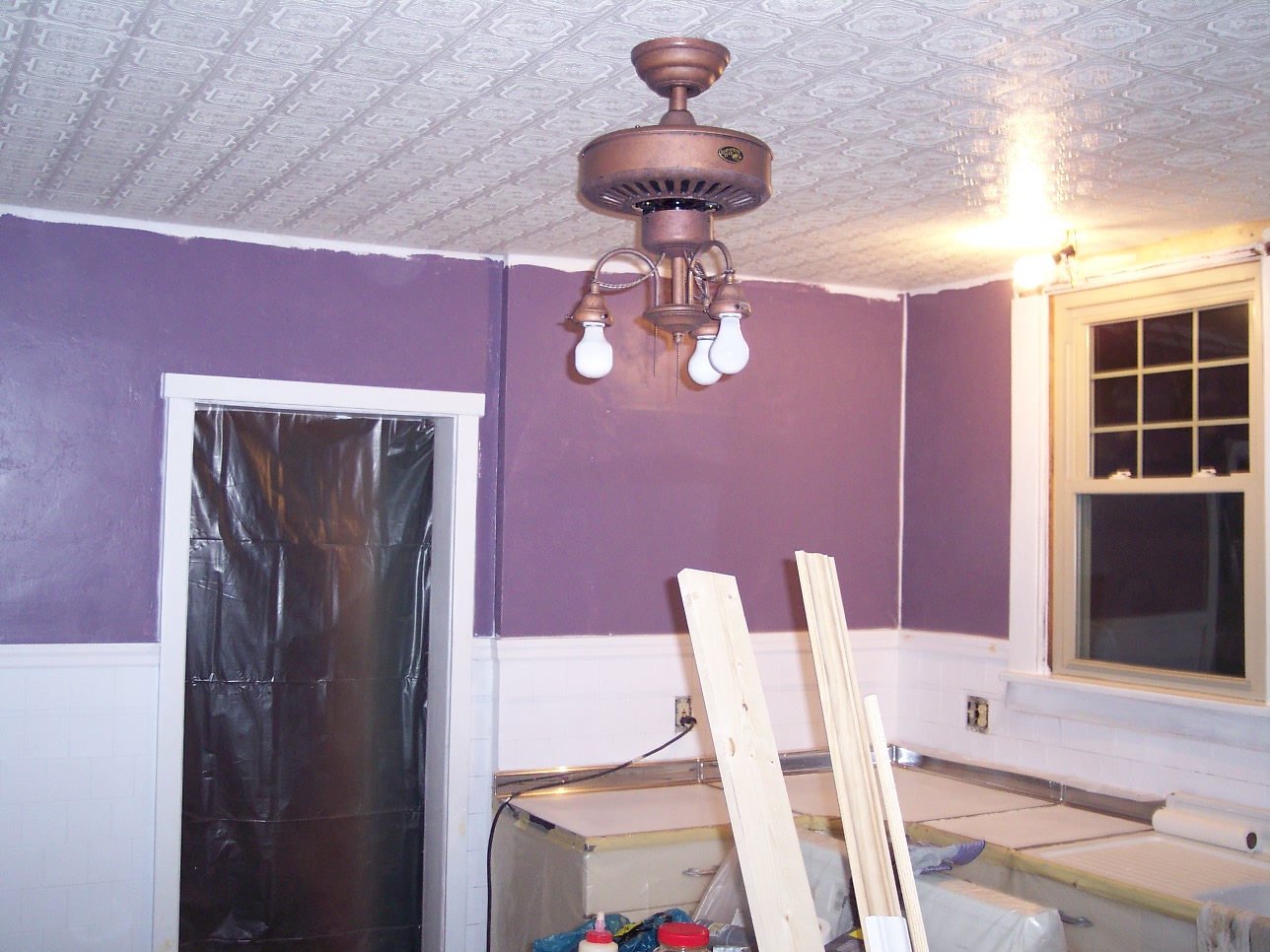 So to start, the tile came off the ceiling, holes were patched, and a plan for upper and lower cabinets along with an island was put into motion. The stove would move over one wall to allow for more uninterrupted counter space, and above the range microwave installed to move it "up" and an angled corner cabinet would be made to cover the gas furnace "chimney" vent. The ceiling would receive furring strips to level it out and Armstrong 12-in x 12-in tin look Wellington ceiling tiles for a traditional look. So with the demolition almost finished we moved to the walls.