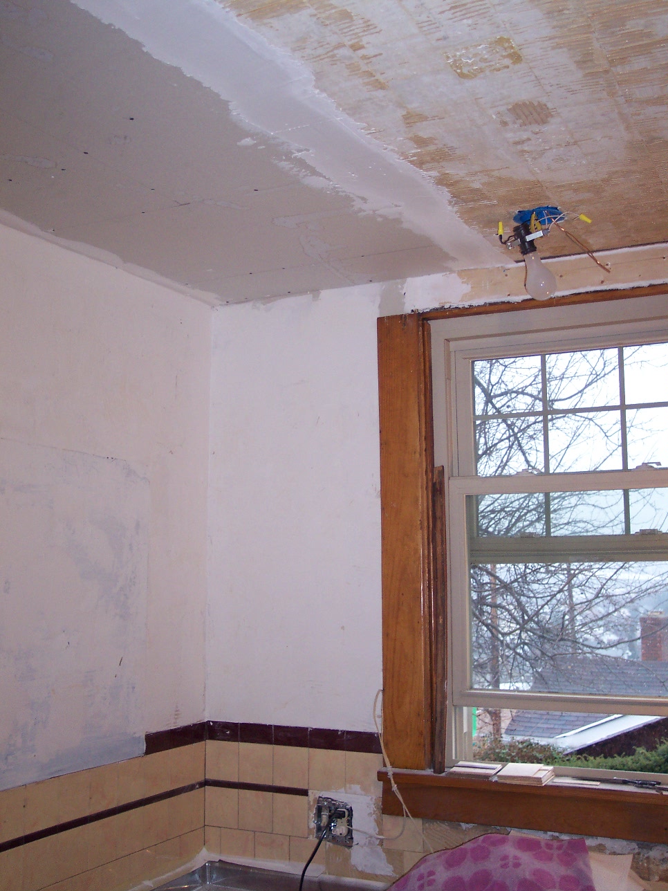 The corner of the ceiling was filled in nicely and the walls continued to receive their texture. There was only one ceiling light in the kitchen. The new plan was for a ceiling fan and two lights over the sink area. We ran all the wires and installed all the boxes to save money on the electricians bill. That way they can just make all the connections!
