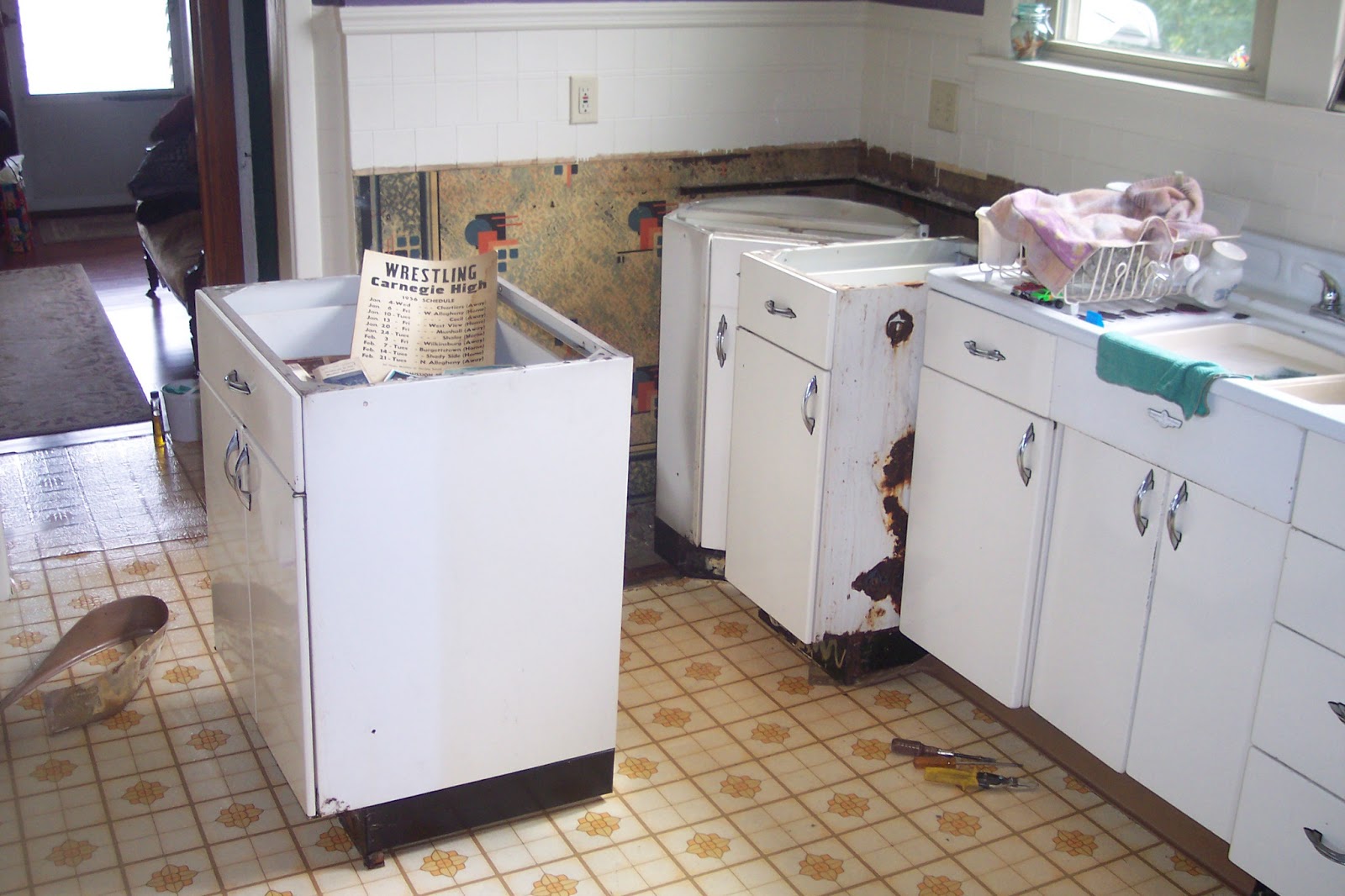 First step, removing the old ones so we can get in with the new. We found all kinds of great memorabilia behind these old metal cabinets.