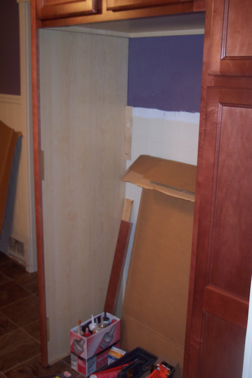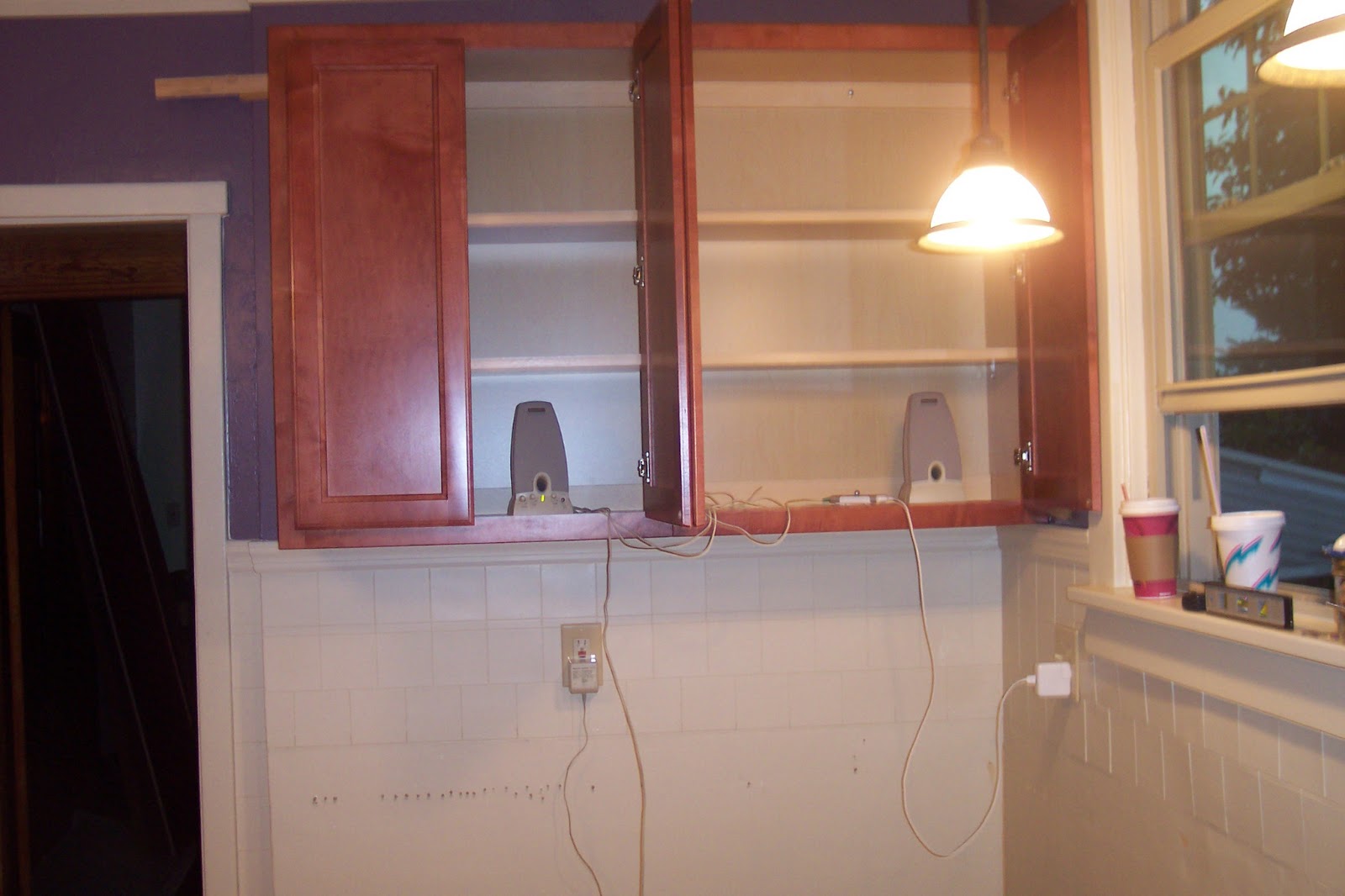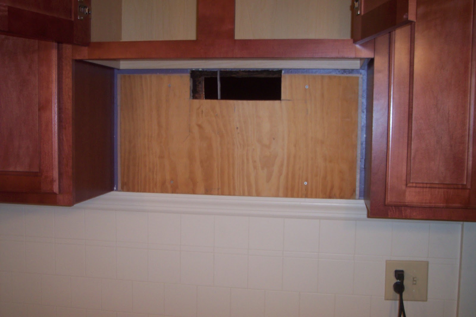 Here goes the first two of the several upper cabinets. Once the upper cabinets were up on the other side of the kitchen we went to work on adding the support and vent for the above the range microwave.