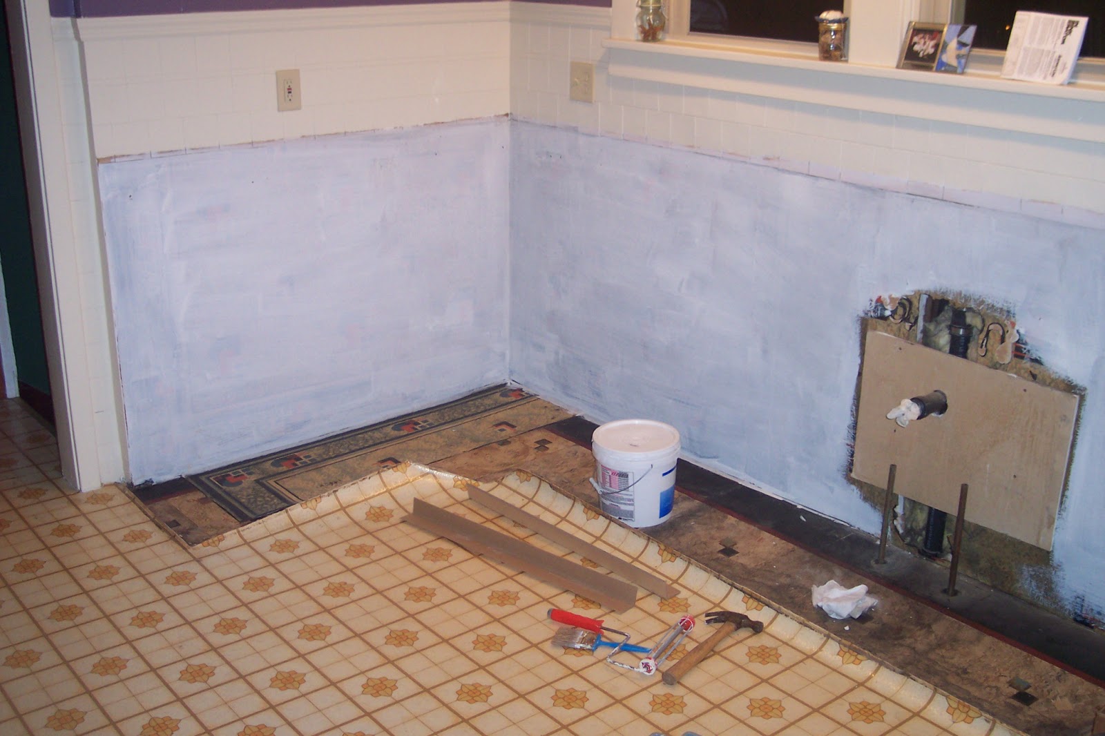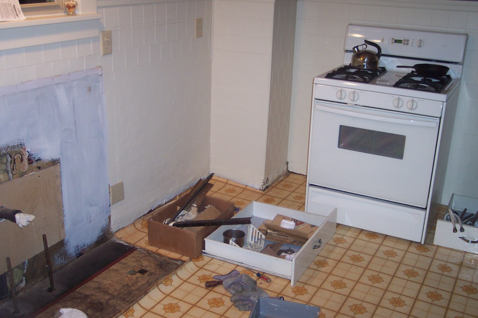 Next step was to even things out, patch any hole in the walls, and seal everything with a nice primer/stain-blocker. The stove is now in its new position. Moving gas lines can be tricky without the right equipment. Home Depot will cut and thread pipe for you but I'd recommend getting someone to do it for you. Unless you have the right tools.