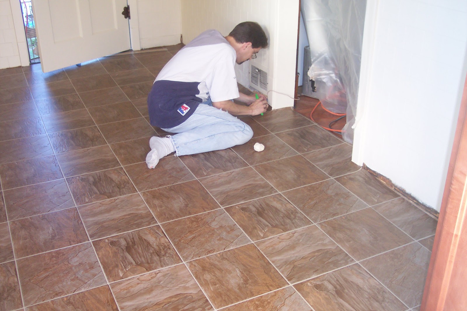 Onto the new floor! We used a Congoleum vinyl flooring which is very resilient and looks phenomenal when in place. This was a roll and has a 25 year warranty to boot! I'm carefully cutting the little angles on all the doorway trim. Most of the flooring floats. The recommended install was for six inches of glue around the edges. The roll comes in 12' lengths and they have wood grain textures available too. This is definitely a measure twice or thrice, and cut once deal. You don't want to have to buy another roll because the piece is an inch short.
