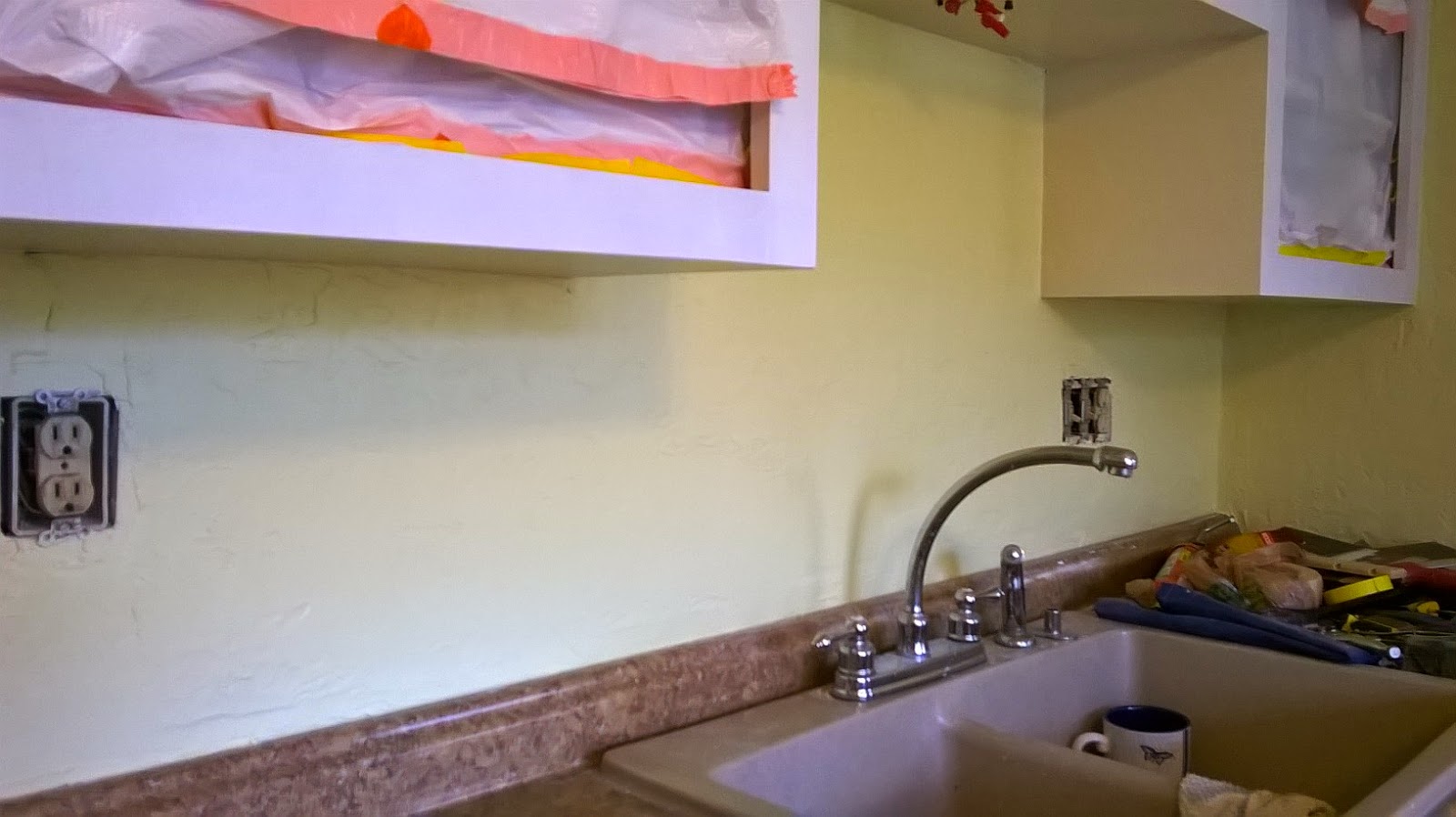 The doors were all removed and painted out of the kitchen. Base cabinets and drawers remained in the kitchen.