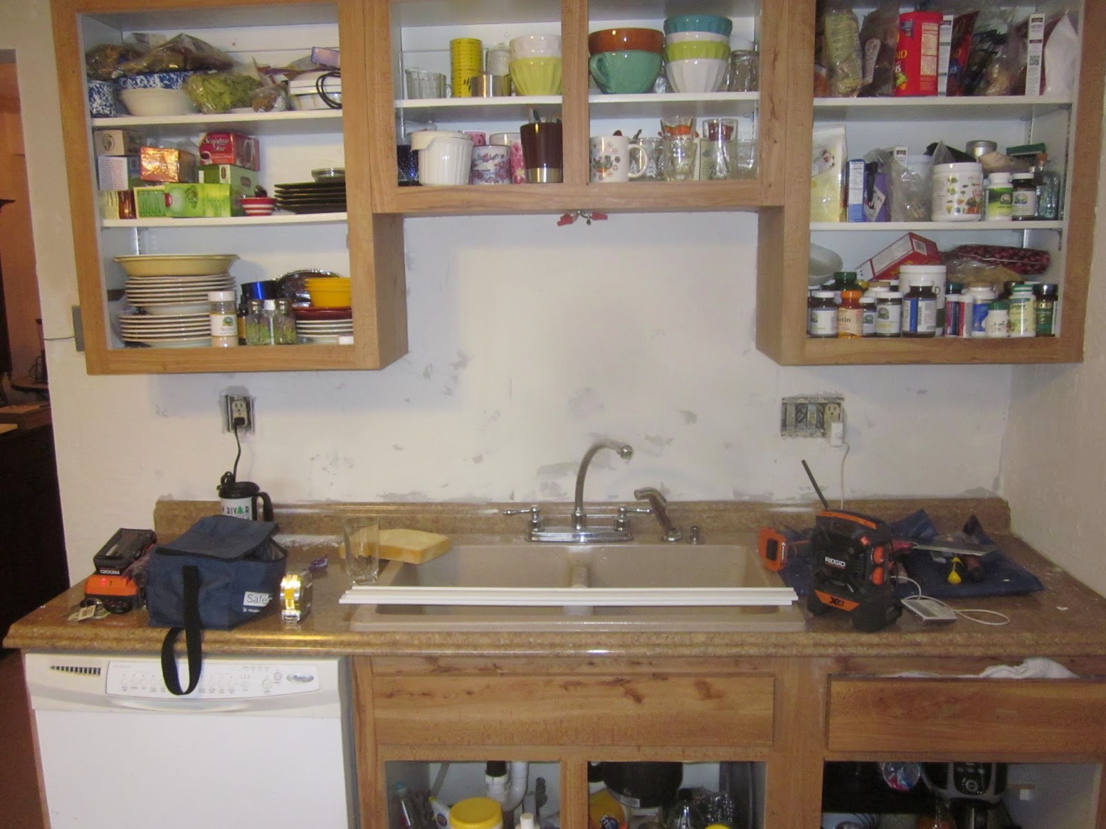 We removed the wall behind the sink area and added 2x4 supports to support new drywall. Once in place we textured the walls with a soft stucco finish.