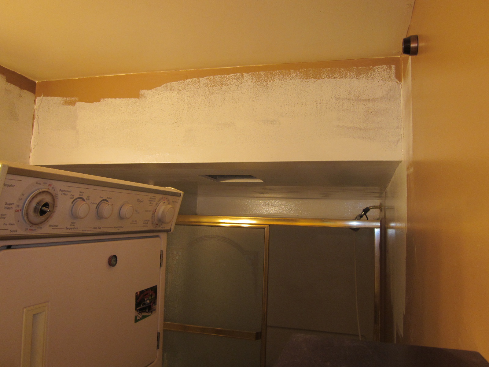 New light fixture and fan in place, patching done, and primer drying. The owner liked the existing colors so we paint matched the original room color.