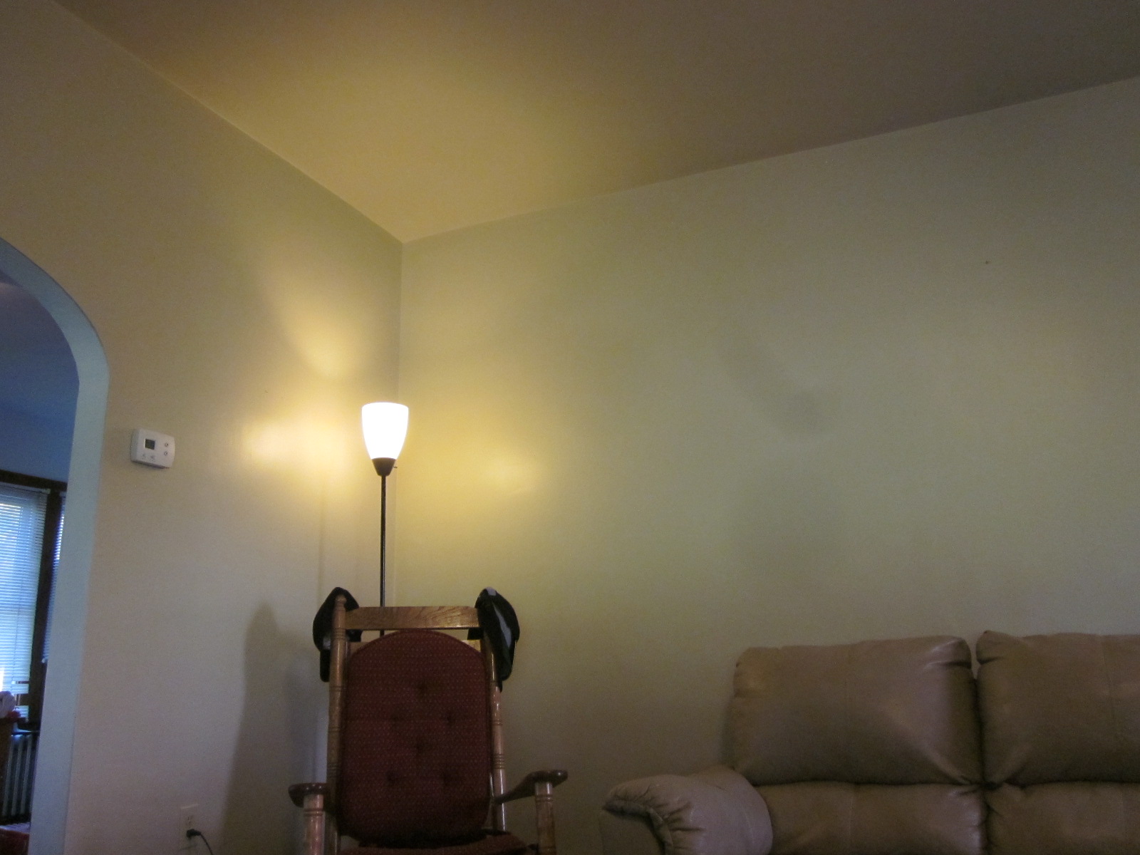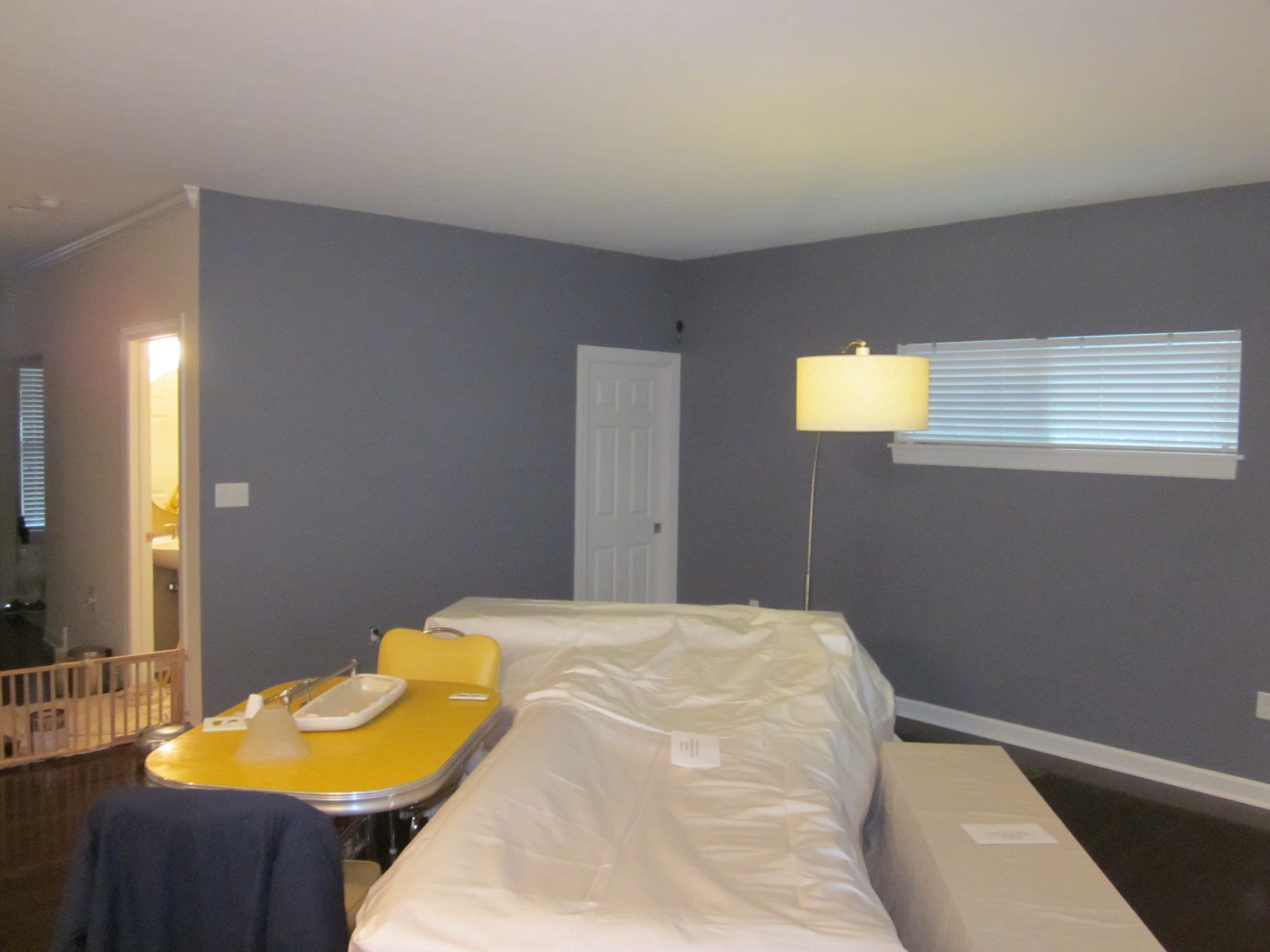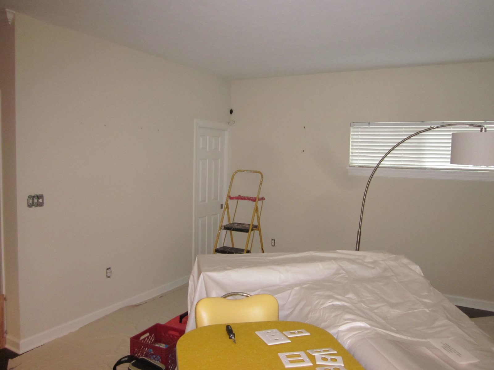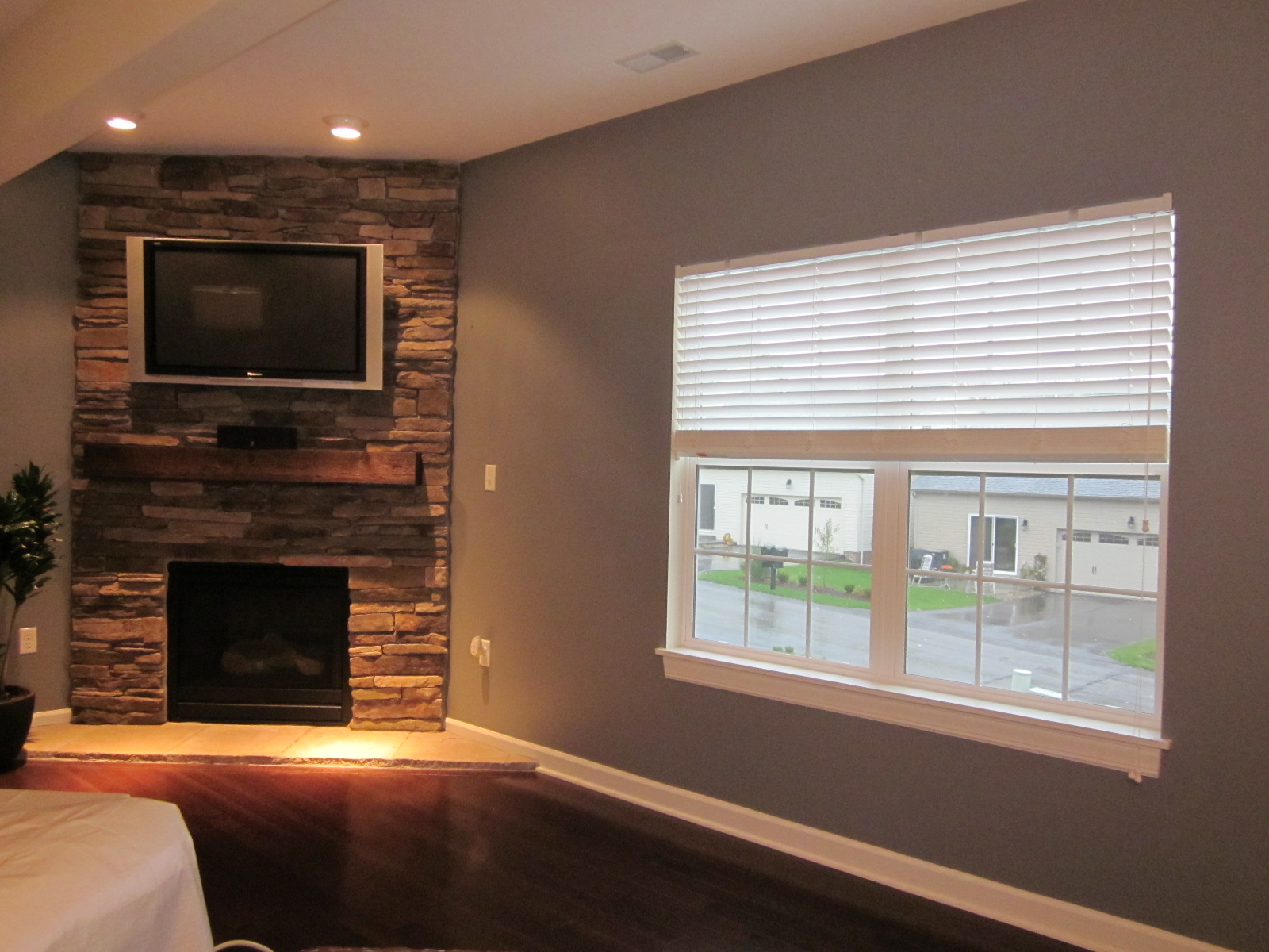 The second project was a new house in Cranberry. The one year waiting period was over, inspection finished, and read to paint. We started with the living area and bathroom. Here is the left side of the living area, the fireplace and color swatches, and the right side ending at the kitchen.