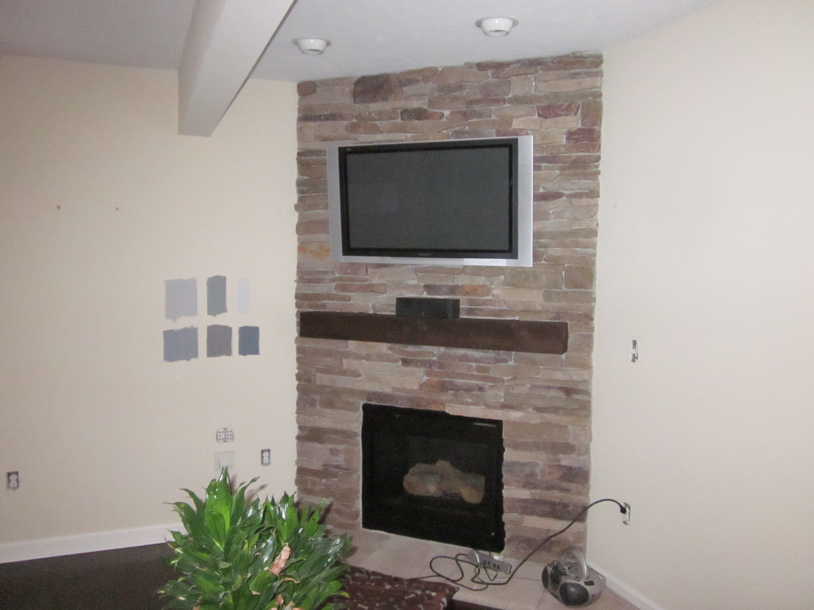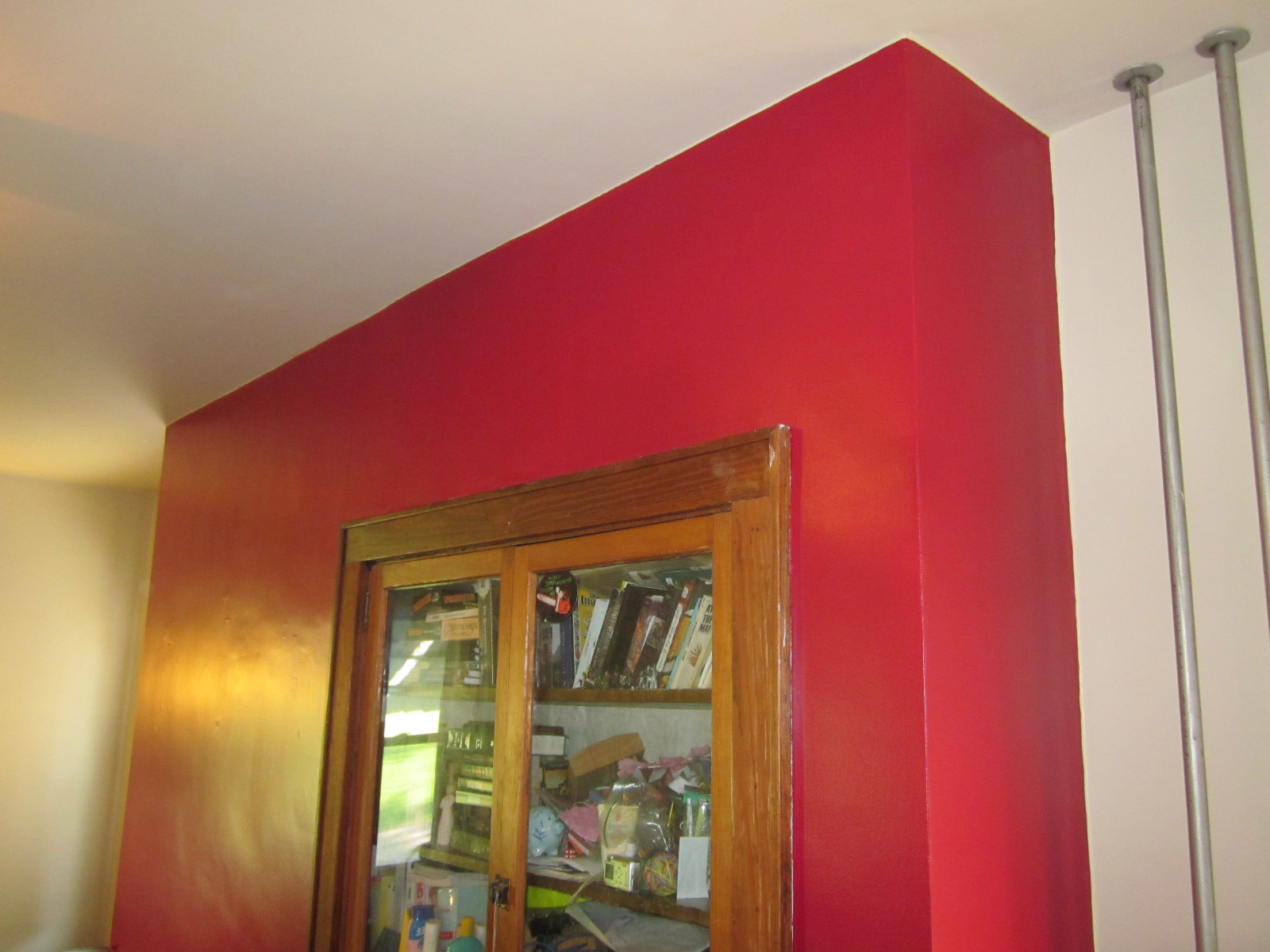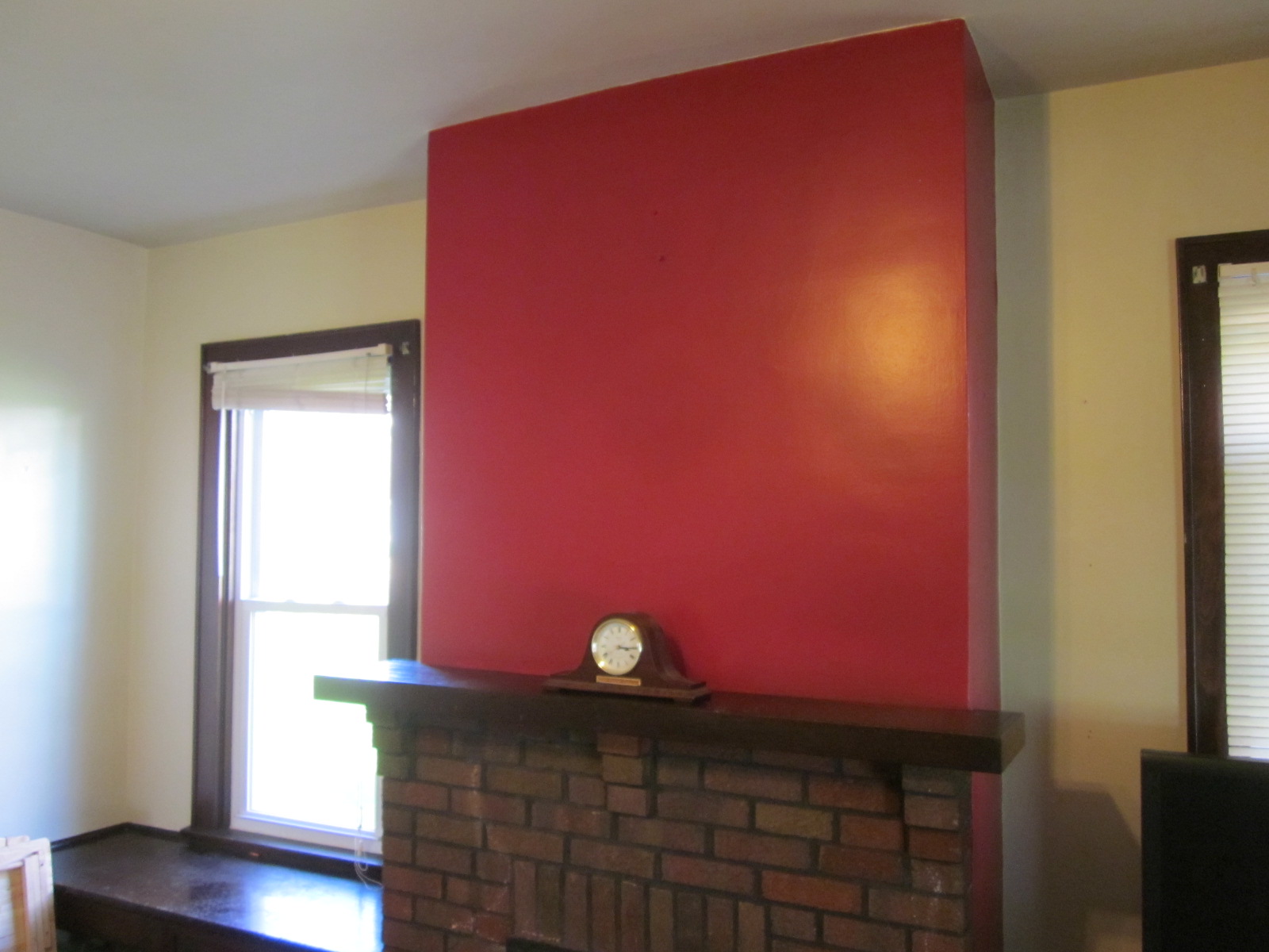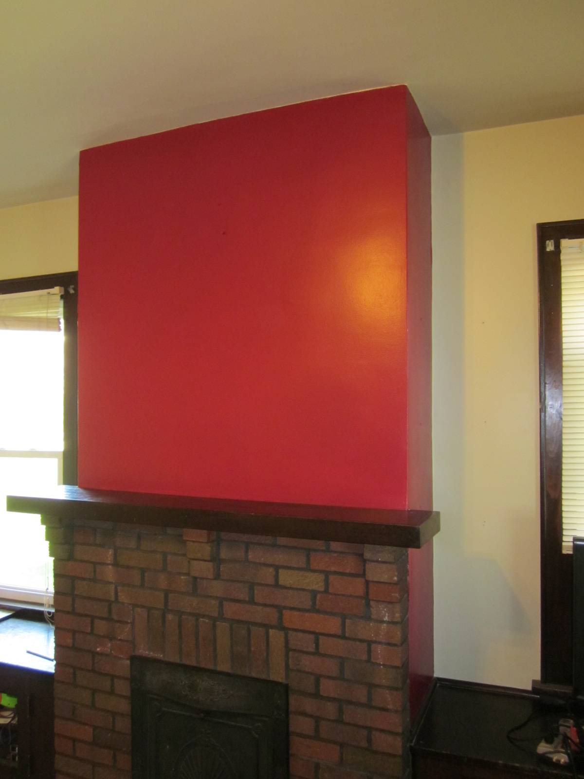 The walls and ceiling were prepped, sanded, and a nice cream Behr Satin paint was applied to the walls and Behr Flat to the ceiling. A very nice deep red was used to accent above the fireplace.