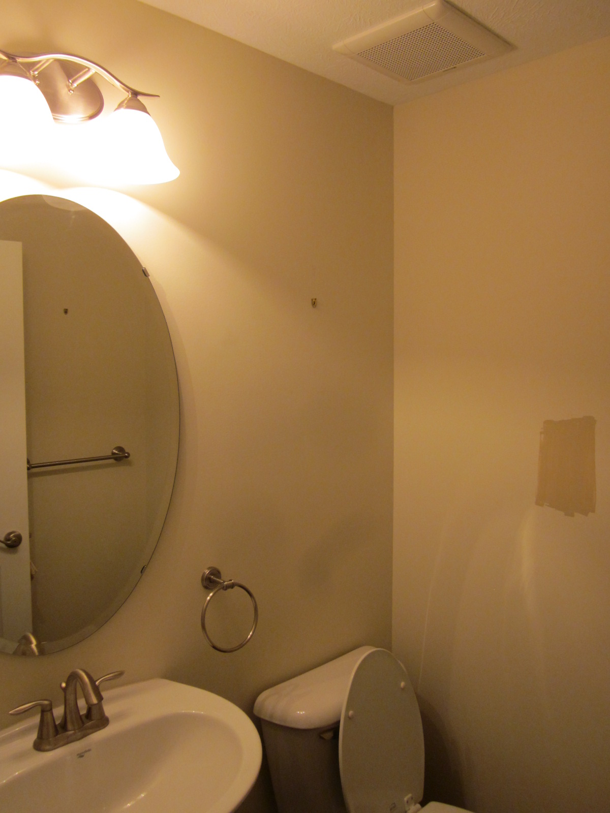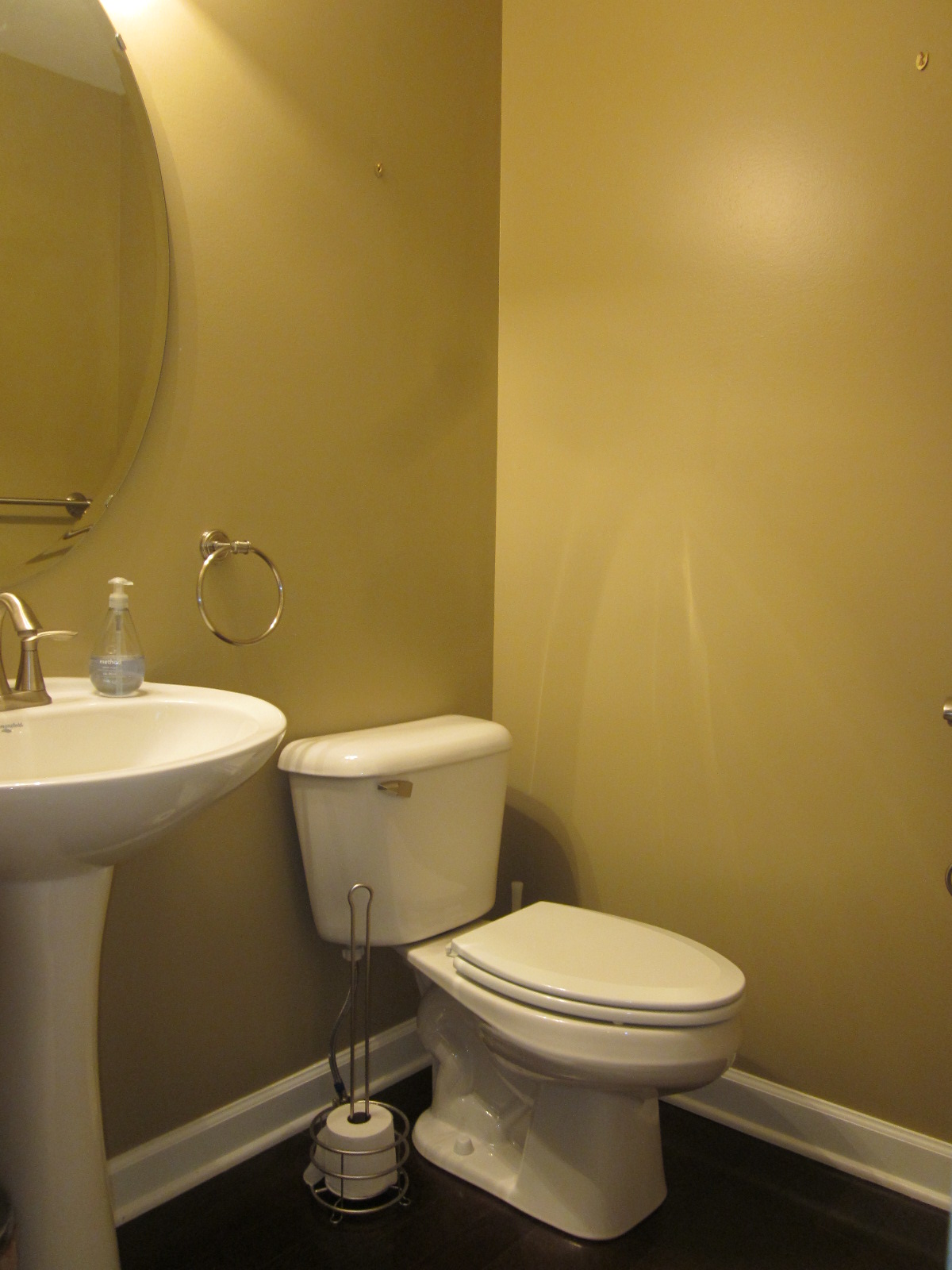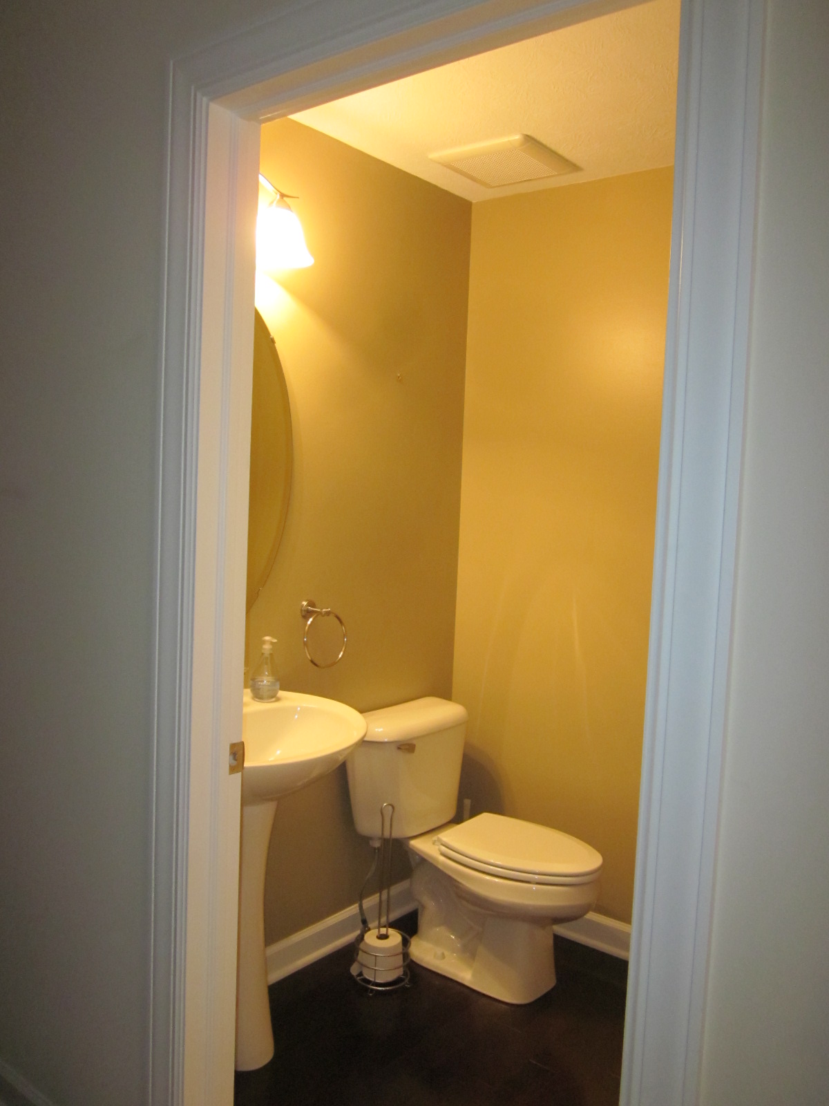 The bathroom is one on the main floor for guests to use when visiting. Once again you can see the color test swatch on the wall.