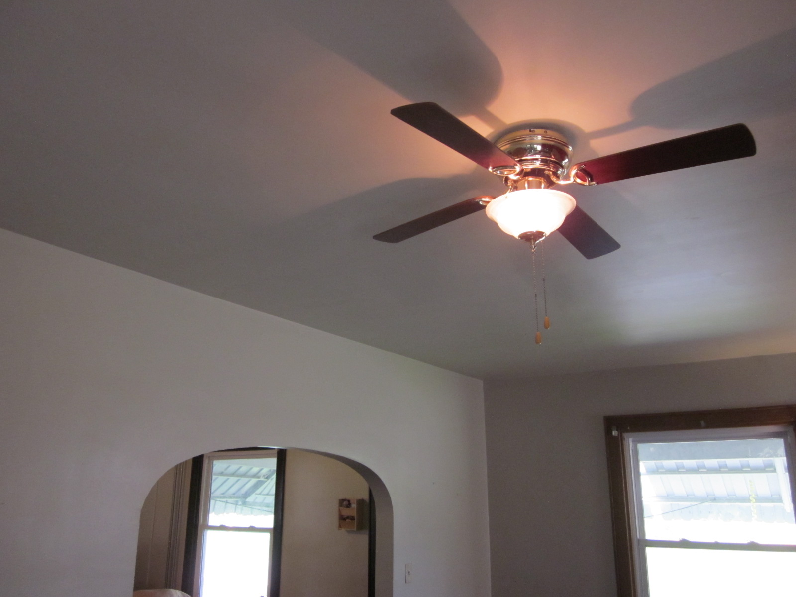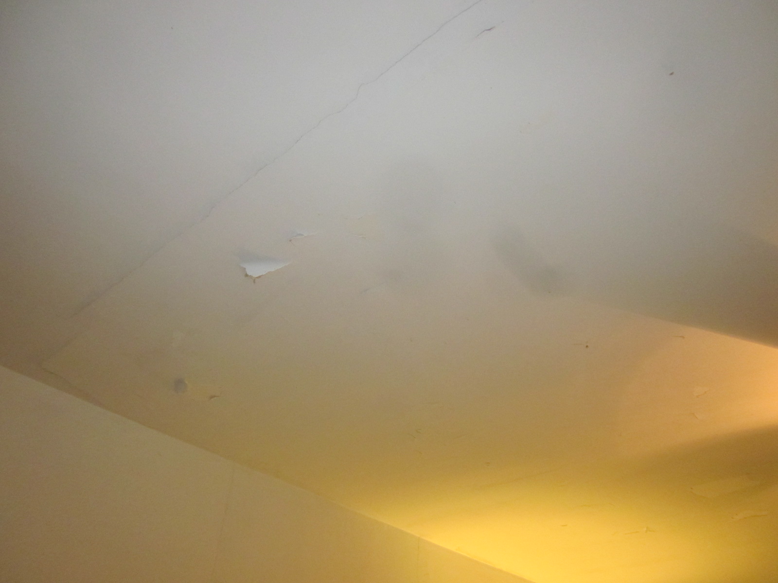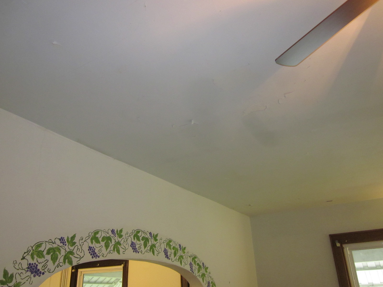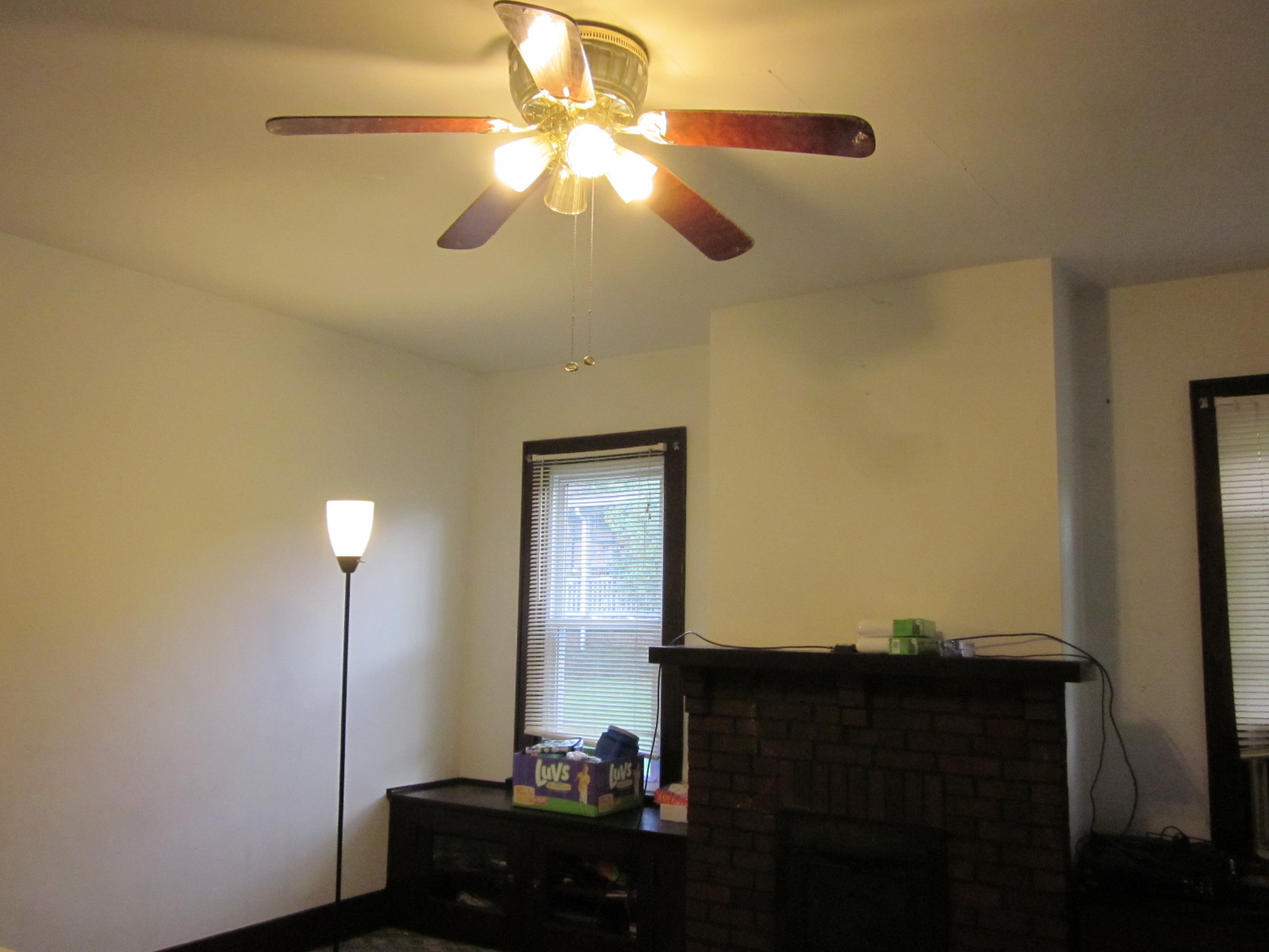 The first house here was a living and dining area. The living room had minor cracking in the plaster and a wonderful accent wall with the fireplace. The dining area was separated from the living area by an archway. It had substantial issues with the ceiling including a large crack across the room and paint peeling.