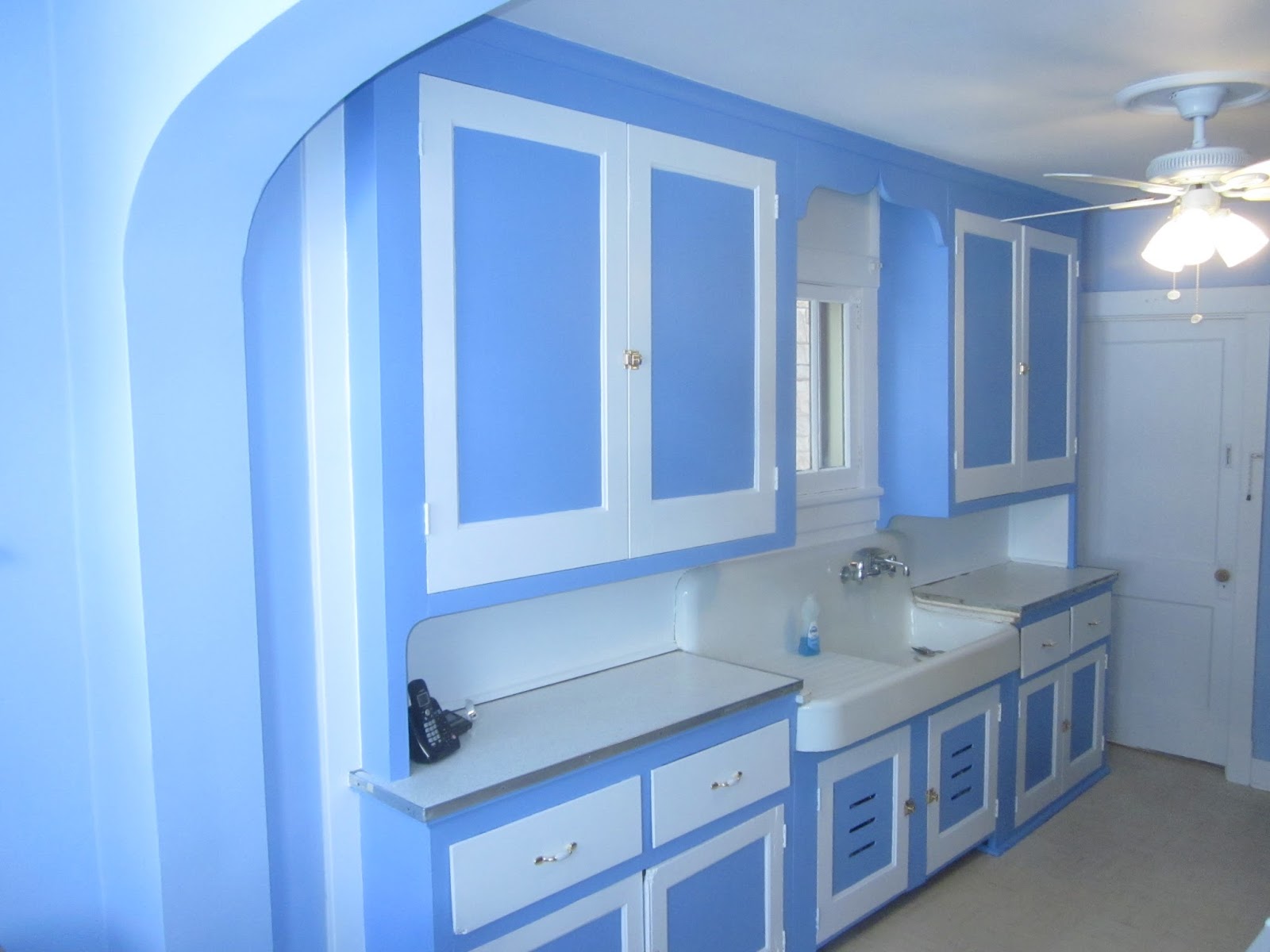 This kitchen could have been boring with blue walls and all white cabinets. By blending the two and adding blue on the cabinet backs and center panels, this original built in kitchen cabinetry is brought to life. (See the whole kitchen here)