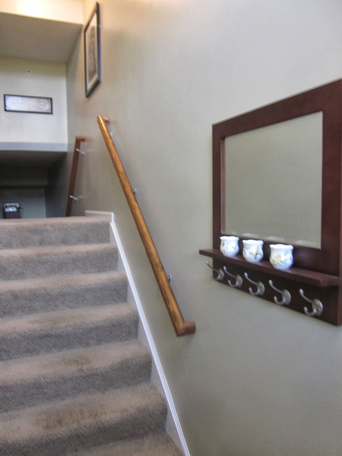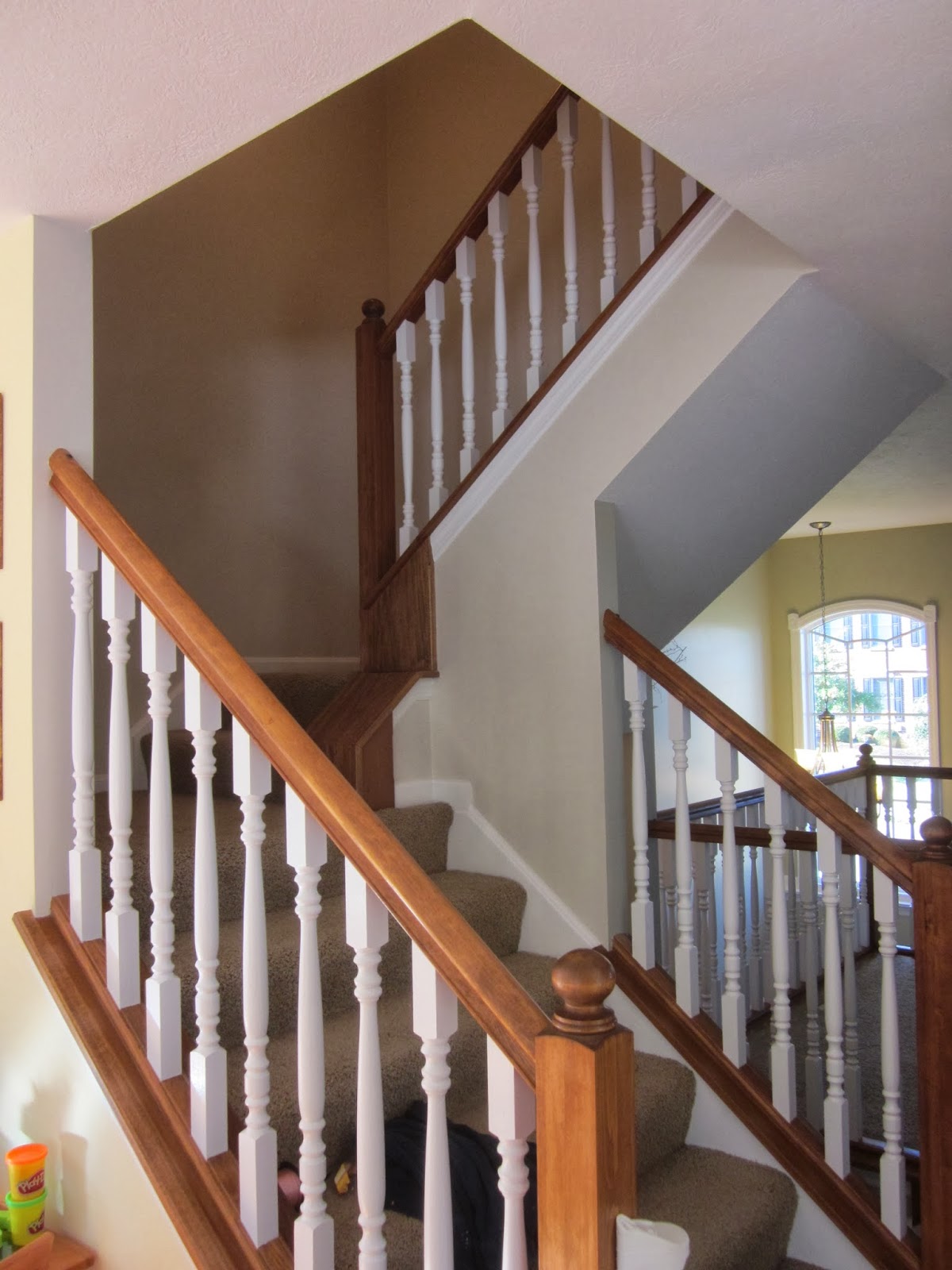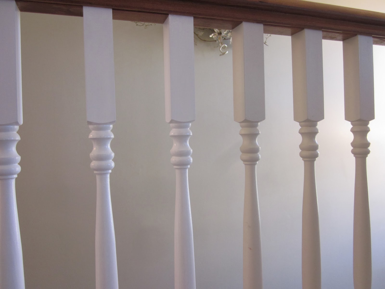 The handrails and base remained a stain while the spindles were painted white. Here you can see the three to the right are ivory and the left three have had their coats brightened with the white. And these spindles too have been freshened up.